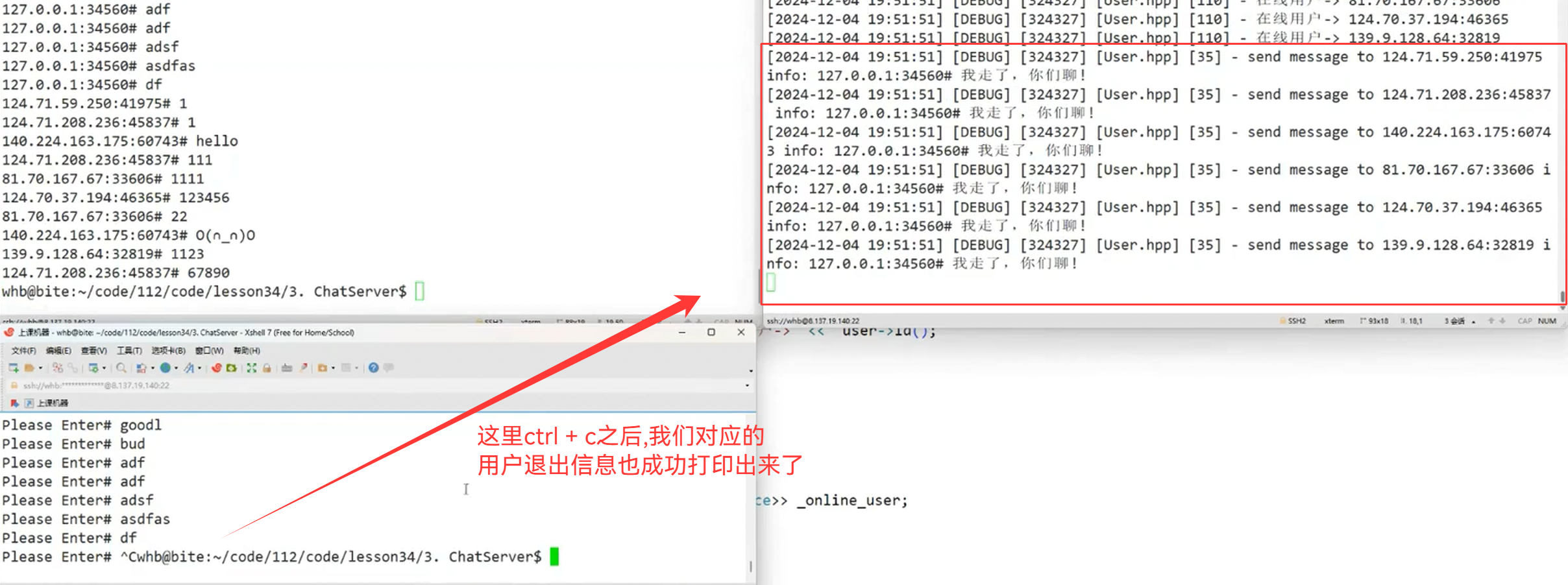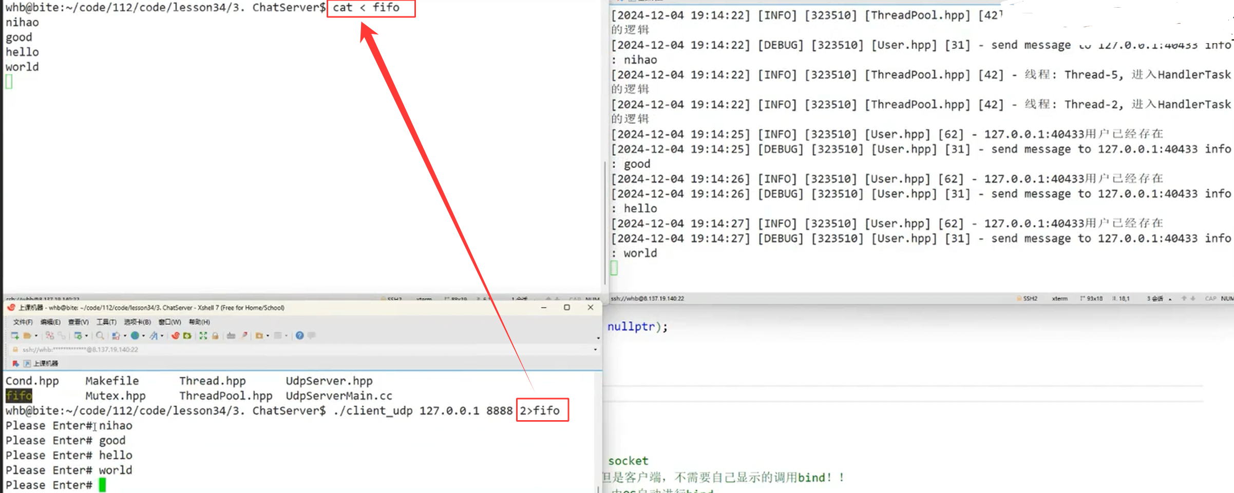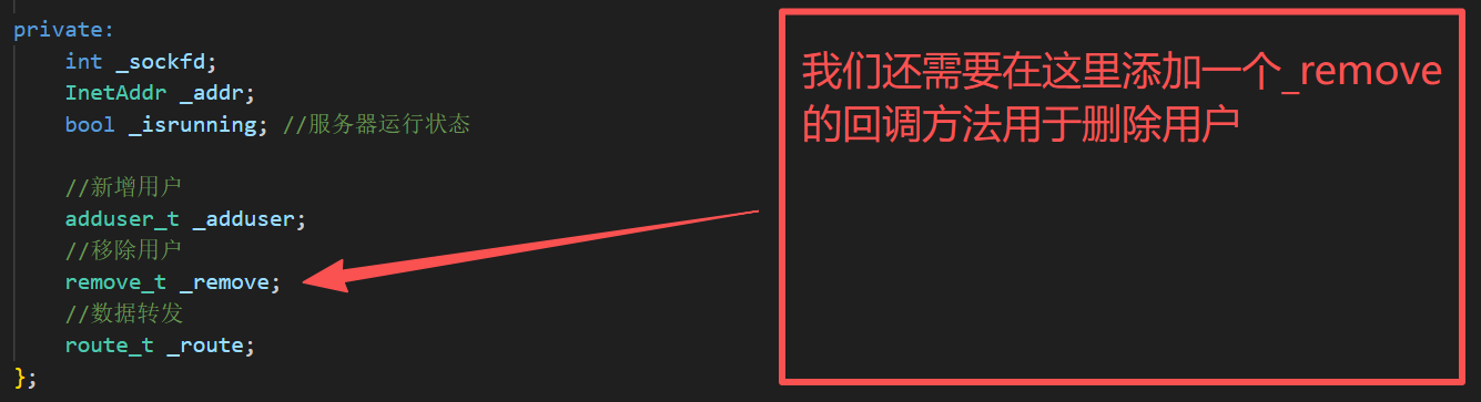 public:UdpServer(uint16_t port = gdefaultport):_sockfd(gsockfd),_addr(port),_isrunning(false){}void InitServer(){// 1.创建套接字_sockfd = ::socket(AF_INET, SOCK_DGRAM, 0);if (_sockfd < 0){LOG(LogLevel::FATAL) << "socket: " << strerror(errno);Die(SOCKET_ERR);}LOG(LogLevel::INFO) << "socket success, sockfd is : " << _sockfd;// 2.1 bind :: 设置进入内核中int n = ::bind(_sockfd,_addr.NetAddr(),_addr.NetAddrLen());if(n < 0){LOG(LogLevel::FATAL) << "bind: " << strerror(errno);Die(BIND_ERR);}LOG(LogLevel::INFO) << "bind success";}void RegisterService(adduser_t adduser,route_t route,remove_t remove){_adduser = adduser;_route = route;_remove = remove;}void Start(){_isrunning = true;while(true){char inbuffer[1024];struct sockaddr_in peer;socklen_t len = sizeof(peer);ssize_t n = ::recvfrom(_sockfd,inbuffer,sizeof(inbuffer)-1,0,CONV(&peer),&len);if(n > 0){//1.消息内容 && 2.谁给我发的InetAddr cli(peer);inbuffer[n] = 0;std::string message;if(strcmp(inbuffer,"Quit!") == 0){//移除观测者_remove(cli);message = cli.Addr() + "# " + "我走了,你们聊!";}else{//2.新增用户_adduser(cli);message = cli.Addr() + "# " + inbuffer;}//3.新增转发模块task_t task = std::bind(UdpServer::_route,_sockfd,message);ThreadPool<task_t>::getInstance()->Equeue(task);std::string clientinfo = cli.Ip() + " : " + std::to_string(cli.Port()) + " # " + inbuffer;LOG(LogLevel::DEBUG) << clientinfo;std::string echo_string = "echo# ";echo_string += inbuffer;::sendto(_sockfd,echo_string.c_str(),echo_string.size(),0,CONV(&peer),sizeof(peer));}}_isrunning = false;}~UdpServer(){if(_sockfd > gsockfd){::close(gsockfd);}}private:int _sockfd;InetAddr _addr;bool _isrunning; //服务器运行状态//新增用户adduser_t _adduser;//移除用户remove_t _remove;//数据转发route_t _route;