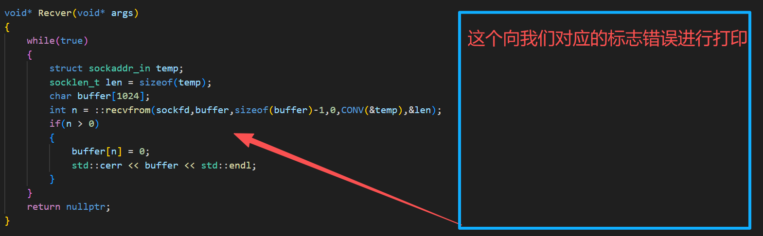 {while(true){struct sockaddr_in temp;socklen_t len = sizeof(temp);char buffer[1024];int n = ::recvfrom(sockfd,buffer,sizeof(buffer)-1,0,CONV(&temp),&len);if(n > 0){buffer[n] = 0;std::cerr << buffer << std::endl;}}return nullptr;