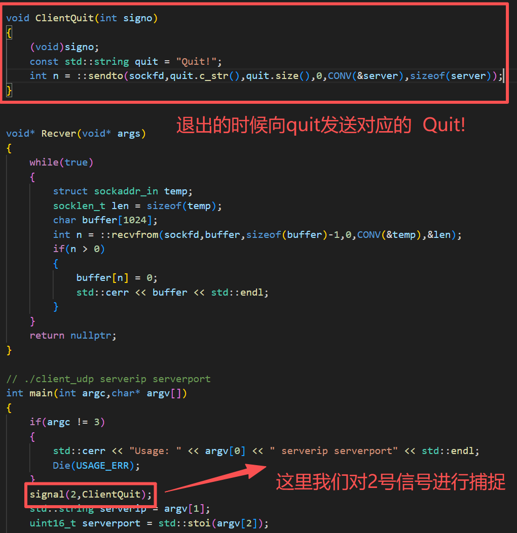 {(void)signo;const std::string quit = "Quit!";int n = ::sendto(sockfd,quit.c_str(),quit.size(),0,CONV(&server),sizeof(server));