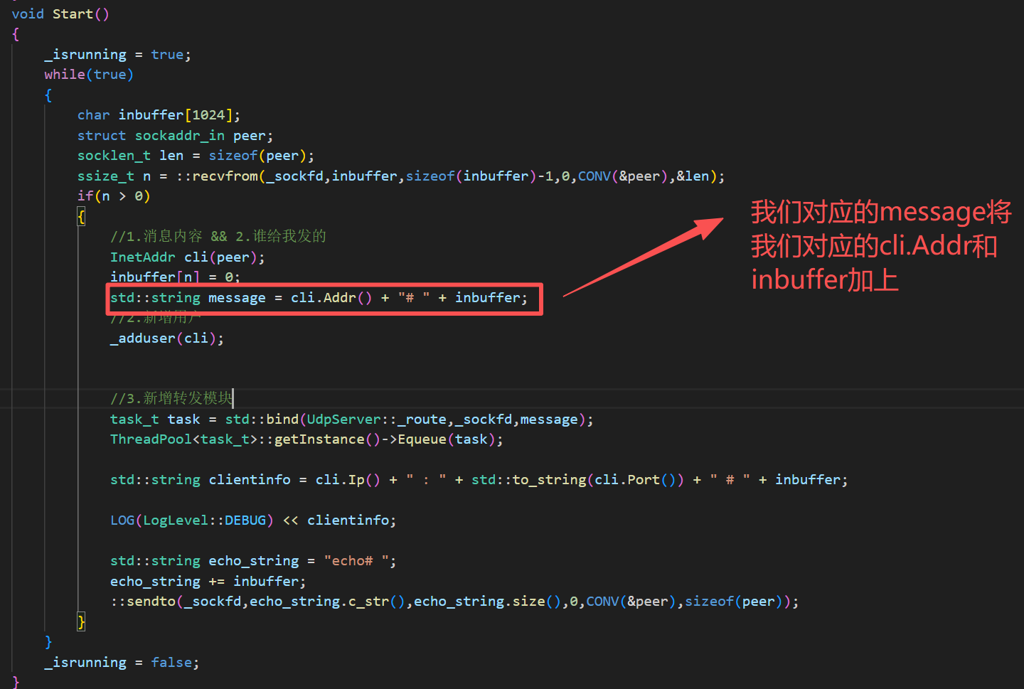 void Start(){_isrunning = true;while(true){char inbuffer[1024];struct sockaddr_in peer;socklen_t len = sizeof(peer);ssize_t n = ::recvfrom(_sockfd,inbuffer,sizeof(inbuffer)-1,0,CONV(&peer),&len);if(n > 0){//1.消息内容 && 2.谁给我发的InetAddr cli(peer);inbuffer[n] = 0;std::string message = cli.Addr() + "# " + inbuffer;//2.新增用户_adduser(cli);//3.新增转发模块task_t task = std::bind(UdpServer::_route,_sockfd,message);ThreadPool<task_t>::getInstance()->Equeue(task);std::string clientinfo = cli.Ip() + " : " + std::to_string(cli.Port()) + " # " + inbuffer;LOG(LogLevel::DEBUG) << clientinfo;std::string echo_string = "echo# ";echo_string += inbuffer;::sendto(_sockfd,echo_string.c_str(),echo_string.size(),0,CONV(&peer),sizeof(peer));}}_isrunning = false;}