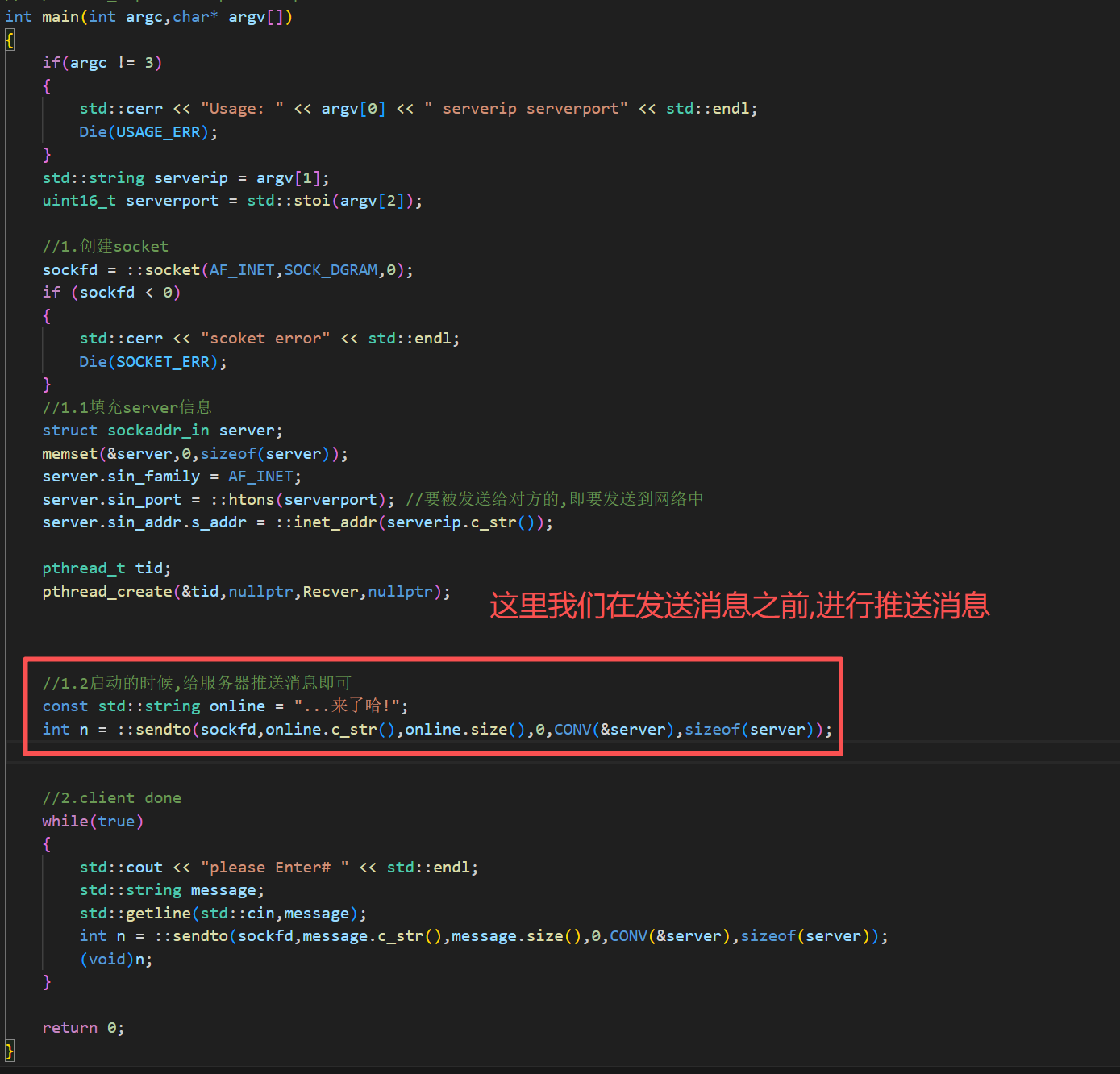 {if(argc != 3){std::cerr << "Usage: " << argv[0] << " serverip serverport" << std::endl;Die(USAGE_ERR);}std::string serverip = argv[1];uint16_t serverport = std::stoi(argv[2]);//1.创建socketsockfd = ::socket(AF_INET,SOCK_DGRAM,0);if (sockfd < 0){std::cerr << "scoket error" << std::endl;Die(SOCKET_ERR);}//1.1填充server信息struct sockaddr_in server;memset(&server,0,sizeof(server));server.sin_family = AF_INET;server.sin_port = ::htons(serverport); //要被发送给对方的,即要发送到网络中server.sin_addr.s_addr = ::inet_addr(serverip.c_str());pthread_t tid;pthread_create(&tid,nullptr,Recver,nullptr);//1.2启动的时候,给服务器推送消息即可const std::string online = "...来了哈!";int n = ::sendto(sockfd,online.c_str(),online.size(),0,CONV(&server),sizeof(server));//2.client donewhile(true){std::cout << "please Enter# " << std::endl;std::string message;std::getline(std::cin,message);int n = ::sendto(sockfd,message.c_str(),message.size(),0,CONV(&server),sizeof(server));(void)n;}return 0;