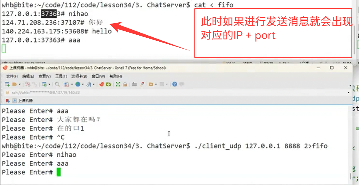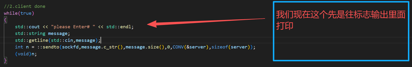 {if(argc != 3){std::cerr << "Usage: " << argv[0] << " serverip serverport" << std::endl;Die(USAGE_ERR);}std::string serverip = argv[1];uint16_t serverport = std::stoi(argv[2]);//1.创建socketsockfd = ::socket(AF_INET,SOCK_DGRAM,0);if (sockfd < 0){std::cerr << "scoket error" << std::endl;Die(SOCKET_ERR);}//1.1填充server信息struct sockaddr_in server;memset(&server,0,sizeof(server));server.sin_family = AF_INET;server.sin_port = ::htons(serverport); //要被发送给对方的,即要发送到网络中server.sin_addr.s_addr = ::inet_addr(serverip.c_str());pthread_t tid;pthread_create(&tid,nullptr,Recver,nullptr);//2.client donewhile(true){std::cout << "please Enter# " << std::endl;std::string message;std::getline(std::cin,message);// client 不需要进行bind吗? socket <->socket// client 必须要有自己的ip和端口!但是客户端,不需要自己显示调用bind!!// 而是,客户端首次sendto消息的时候,由OS自动进行bind// 1.如何理解client自动随机bind端口号? 一个端口号,由OS自动进行bind(客户端不需要被人找到)// 2.如何理解server需要显示的bind? 服务器端口号必须稳定,所以这里不能由OS随机bindint n = ::sendto(sockfd,message.c_str(),message.size(),0,CONV(&server),sizeof(server));(void)n;}return 0;