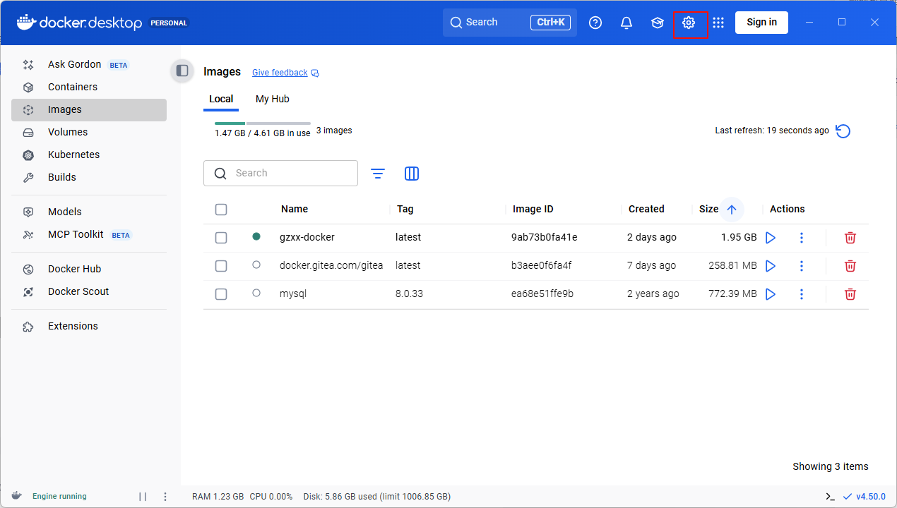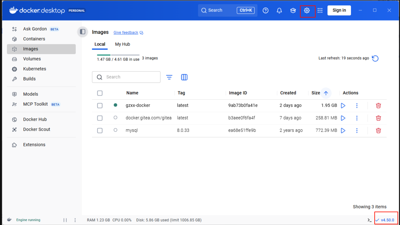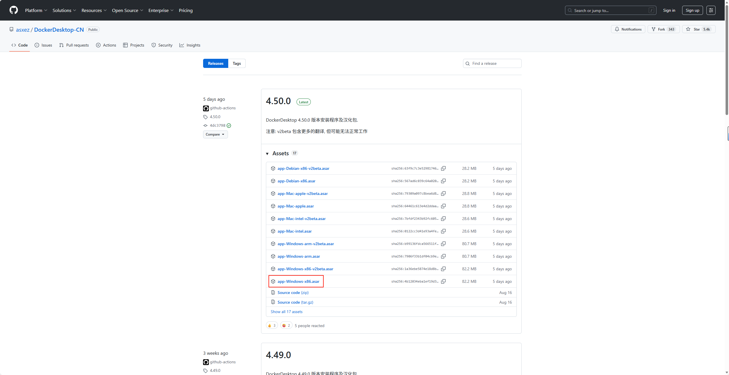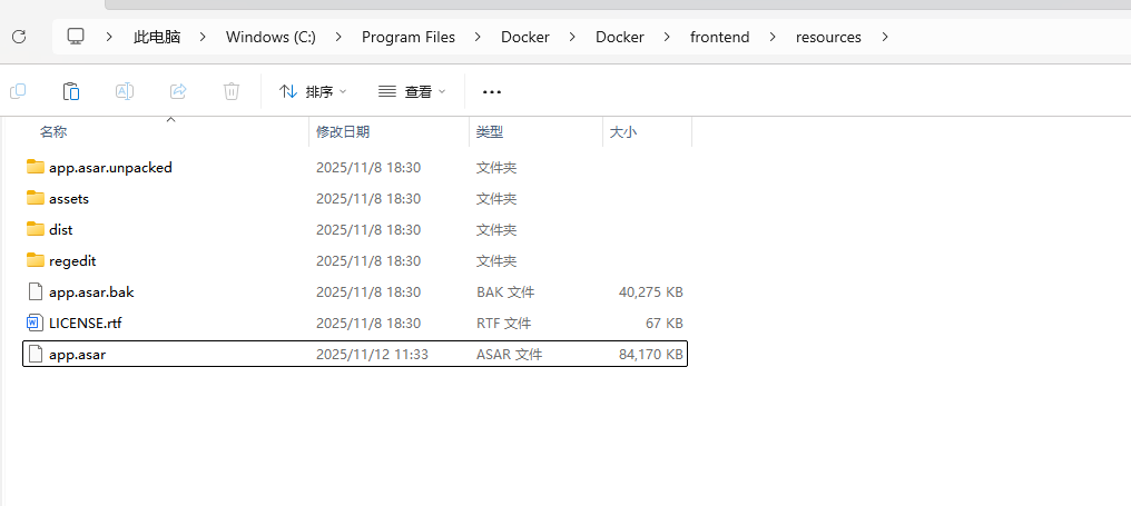 先关闭退出Docker Desktop,要不然修改不了里面的文件,打开路径: C:\Program Files\Docker\Docker\frontend\resources,将原本的app.asar进行备份,改成app.asar.bak,将下载后的汉化文件放在该目录,然后重命名为app.asar