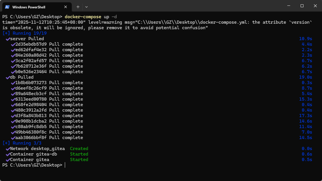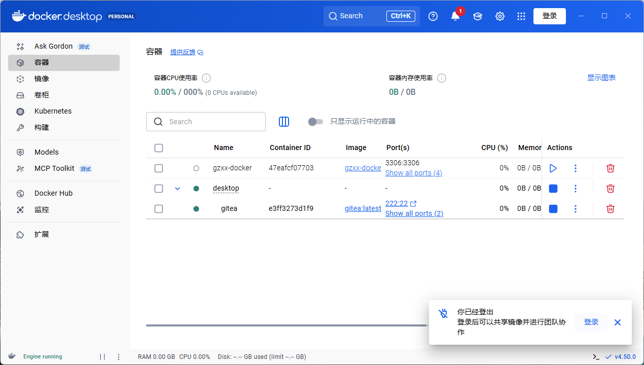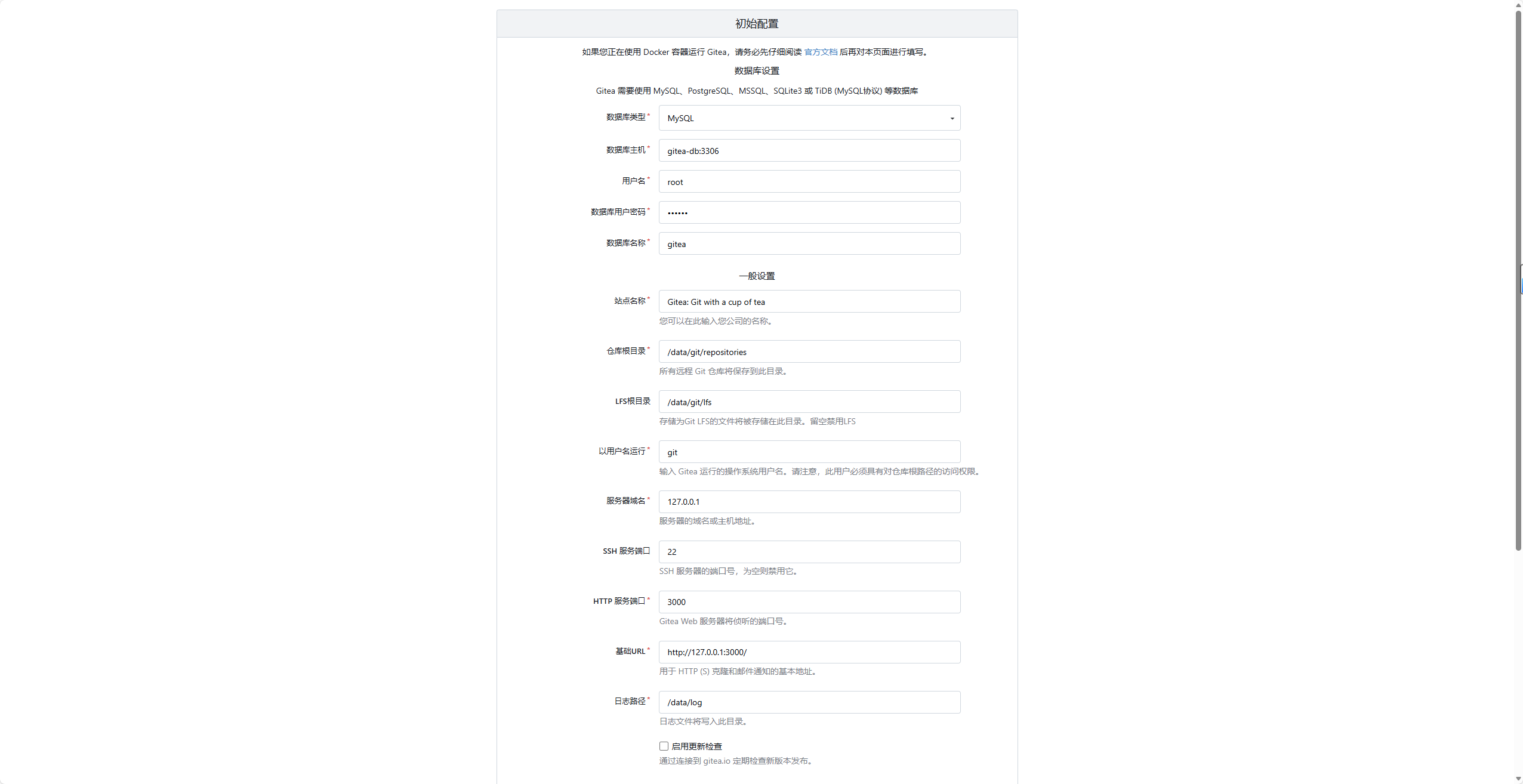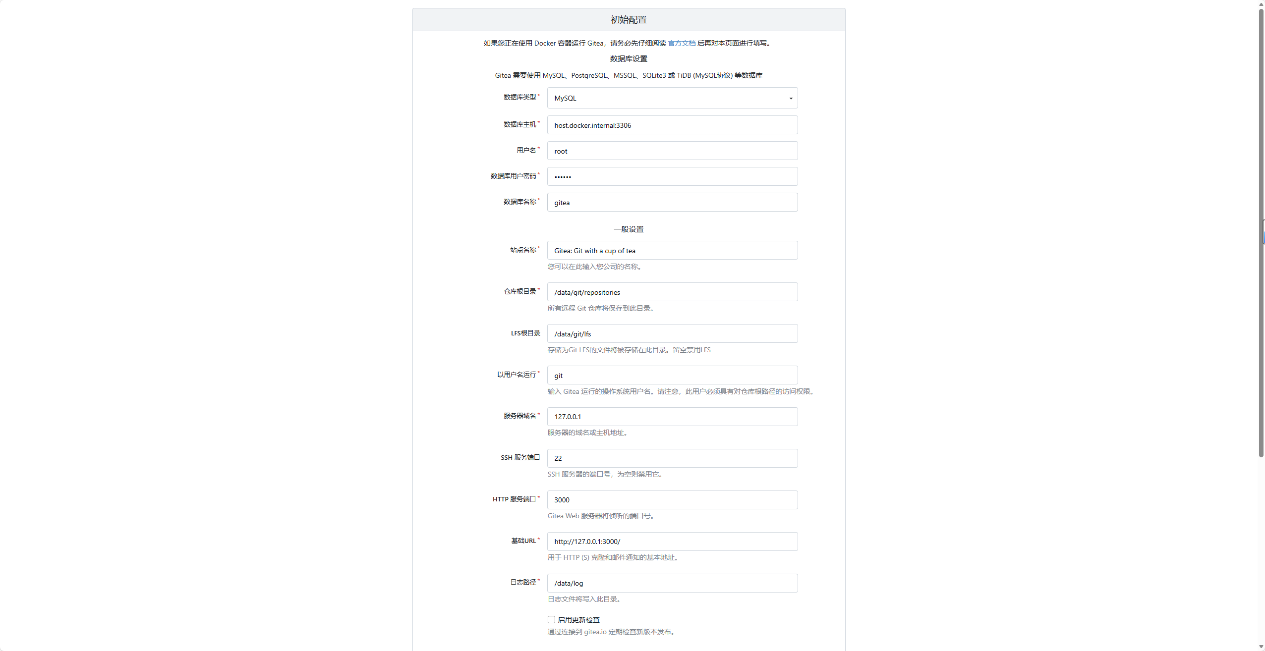version: "3"networks:gitea:external: false services:server:image: docker.gitea.com/gitea:latest container_name: gitea environment:- USER_UID=1000 - USER_GID=1000 - GITEA__database__DB_TYPE=mysql- GITEA__database__HOST=host.docker.internal:3306 - GITEA__database__NAME=gitea - GITEA__database__USER=root- GITEA__database__PASSWD=123456- GITEA__log__LEVEL=info- GITEA__log__ROOT_PATH=/data/logrestart: always networks:- gitea volumes:- /etc/timezone:/etc/timezone:ro - /etc/localtime:/etc/localtime:roports:- "3000:3000" - "222:22" command: |sh -c "mkdir -p /data/log && chown git:git /data/log && /usr/bin/entrypoint"
