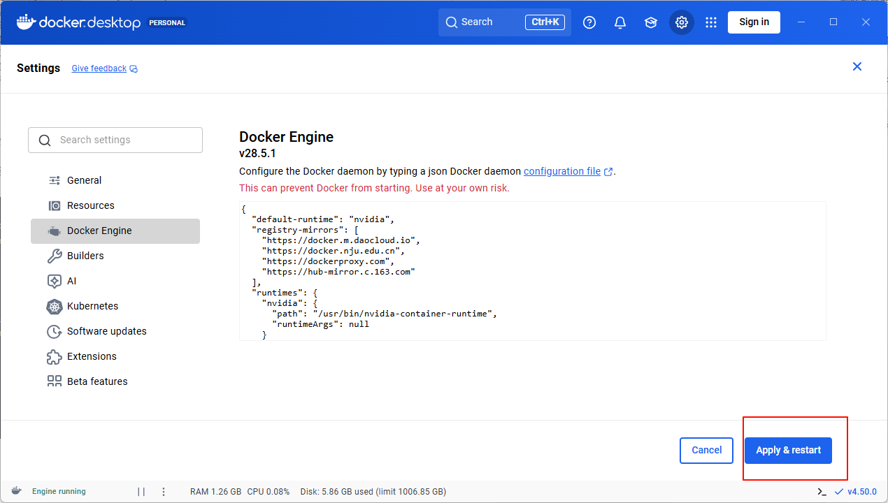 {"default-runtime": "nvidia","registry-mirrors": ["https://docker.m.daocloud.io","https://docker.nju.edu.cn","https://dockerproxy.com","https://hub-mirror.c.163.com"],"runtimes": {"nvidia": {"path": "/usr/bin/nvidia-container-runtime","runtimeArgs": null}}