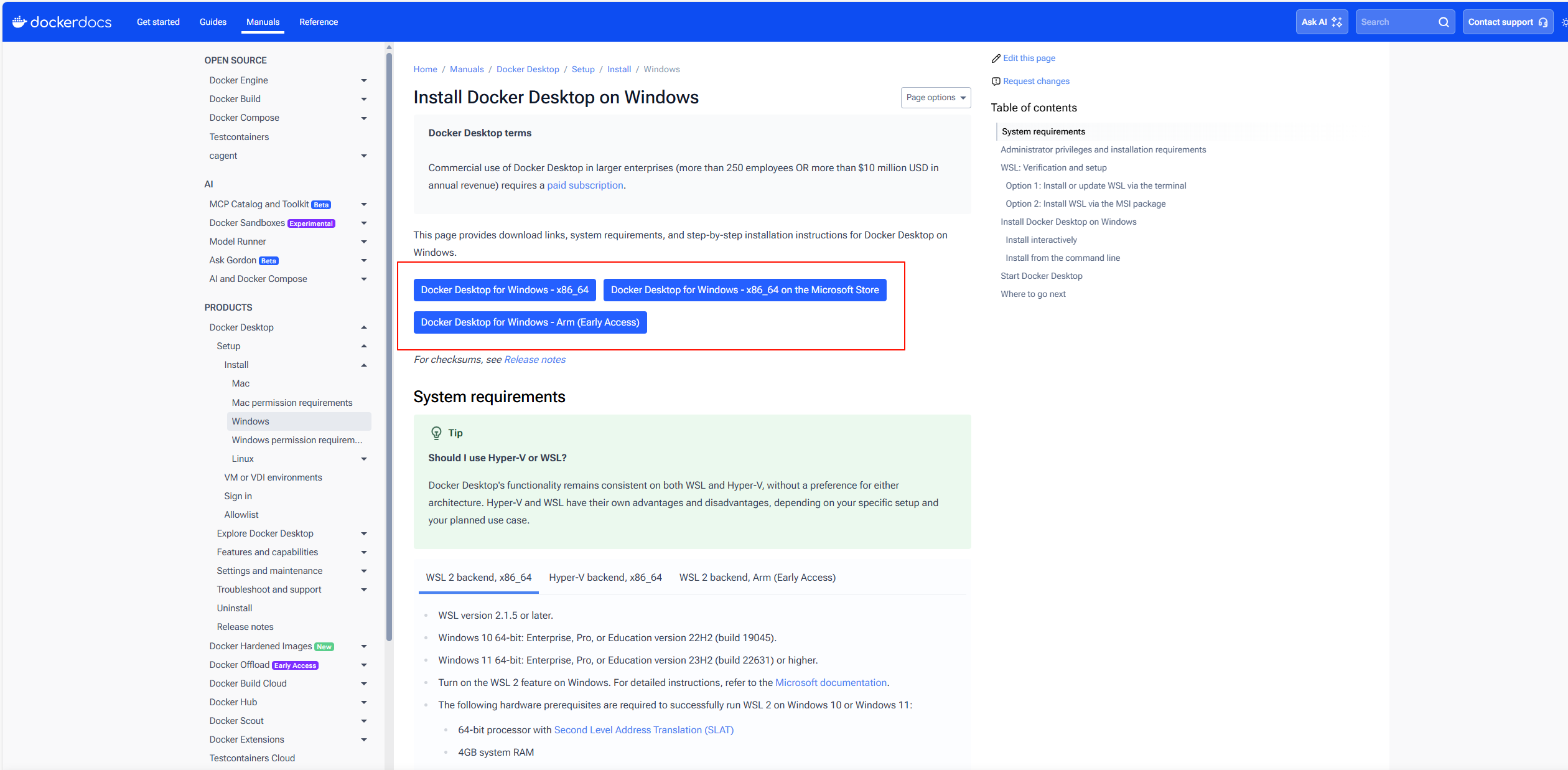 官网:Windows | Docker Docs (可能需要魔法才能打开)