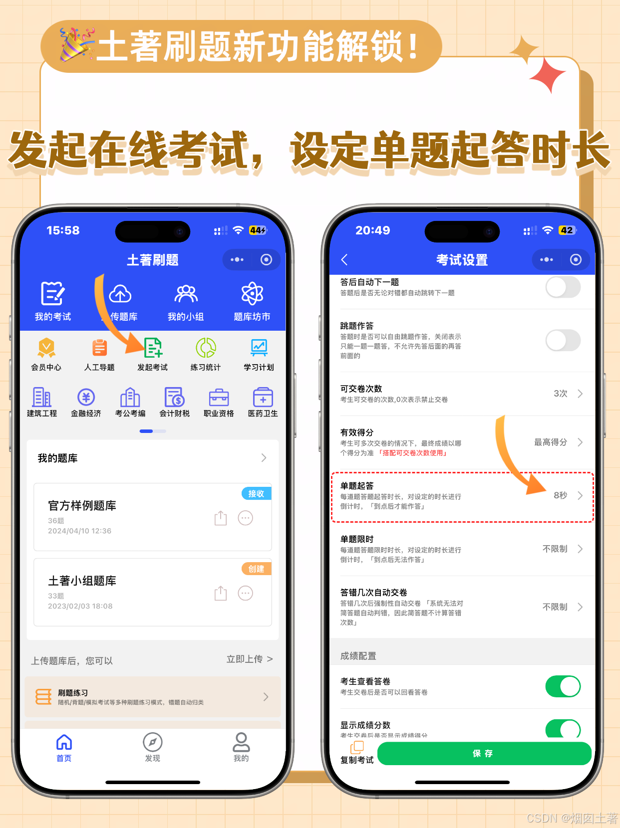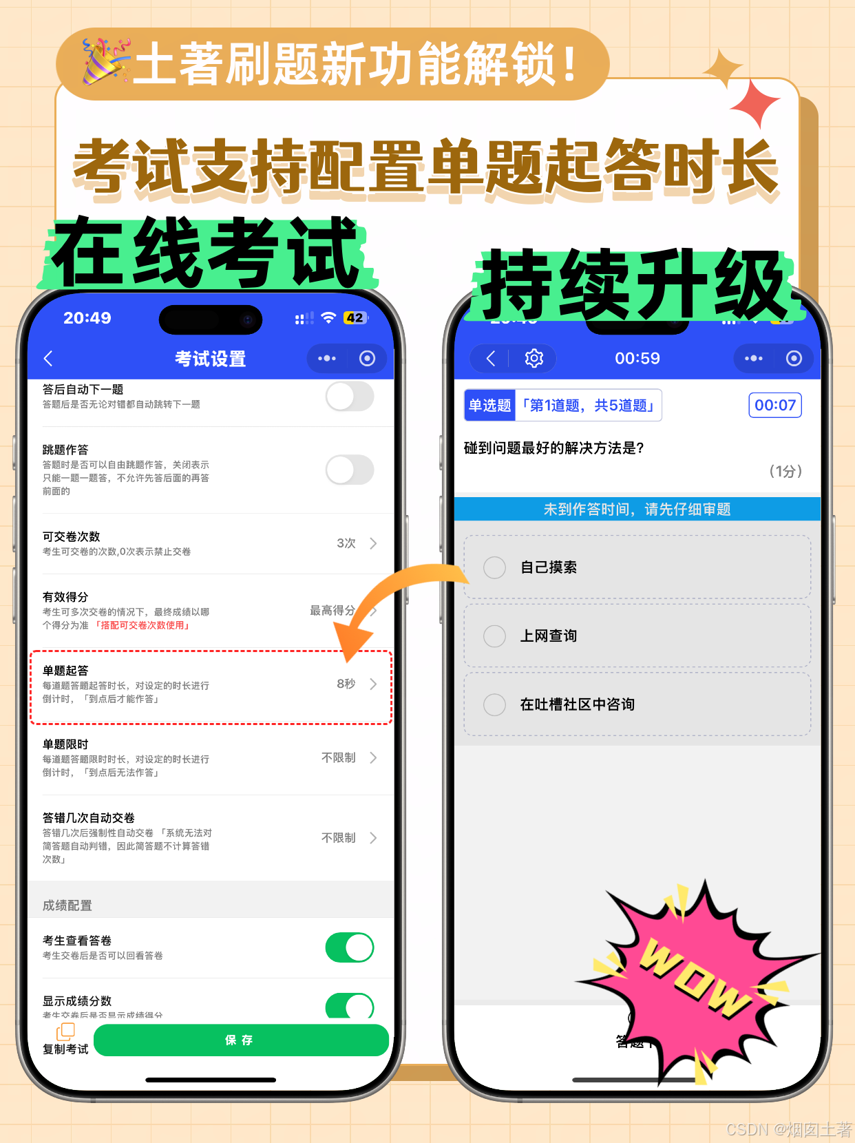 🙋有小伙伴反馈:我组织了一场在线答题活动,使用「土著刷题小🍊序」发起了一场在线考试,有些考生答太快了,没有认真审题,答不到预期的考察效果,,答题时能否限定考生起答时间?也就是要让考生等一会再答,这样的考察效果才真实有效