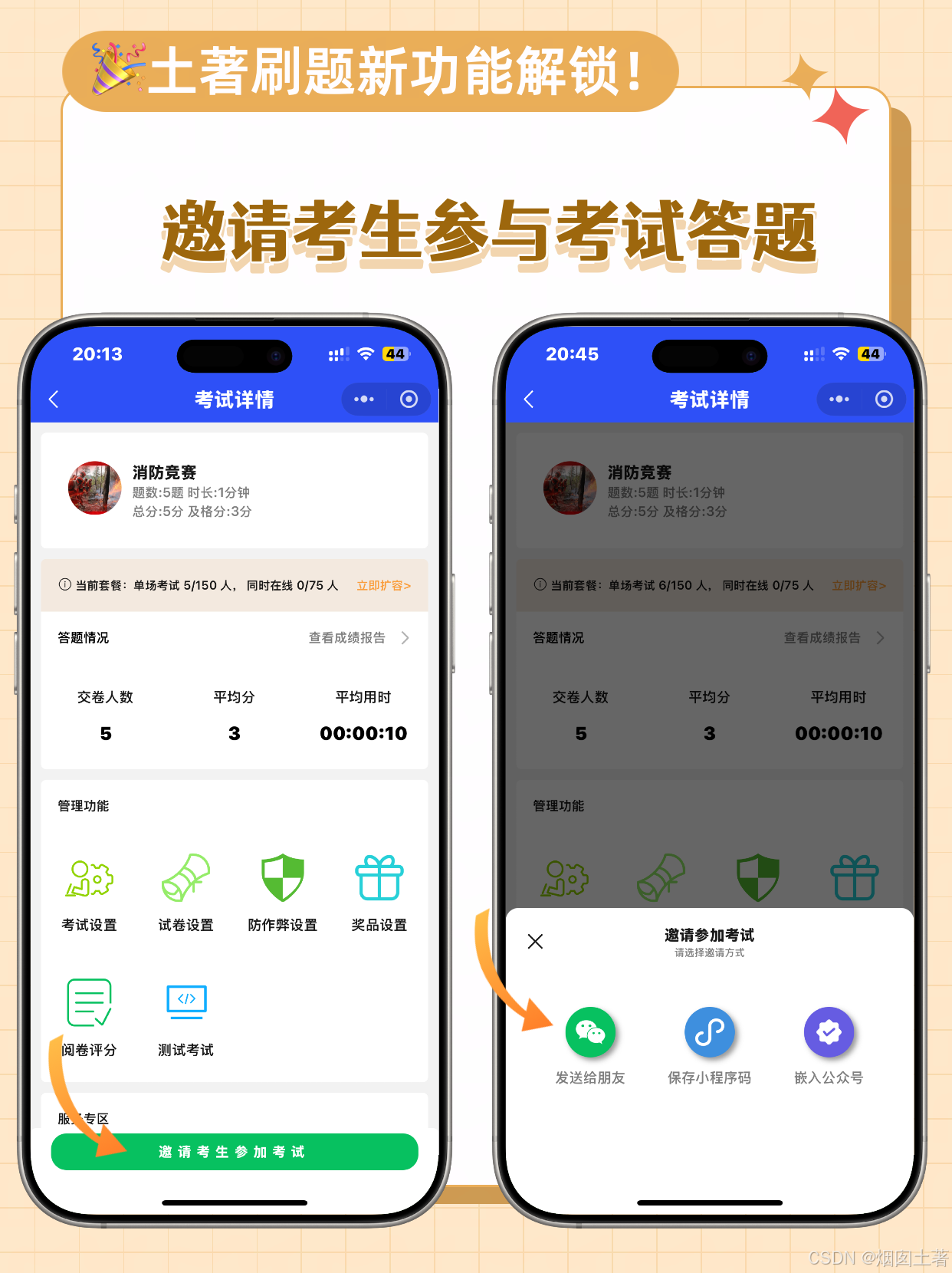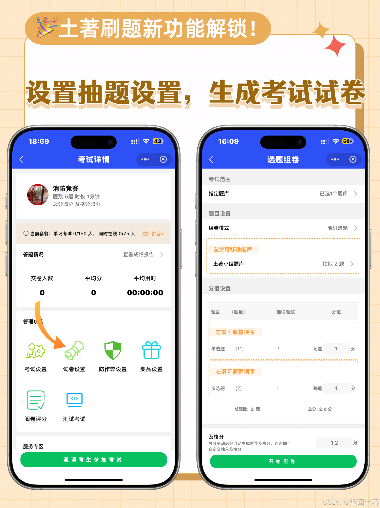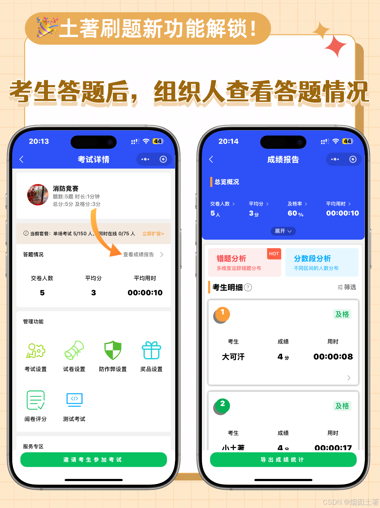 ✅ 考试模块:刷题组织者可对刷题用户发起考试,考察学习成果,对此提供了整套标准考试流程:发起考试️️➡️选题组卷️➡️️防作弊设置️➡️️奖品设置️➡️️阅卷评分️➡️️排行榜️➡️️获奖名单️➡️️成绩分析➡️️成绩导出️➡️️考试试卷导出