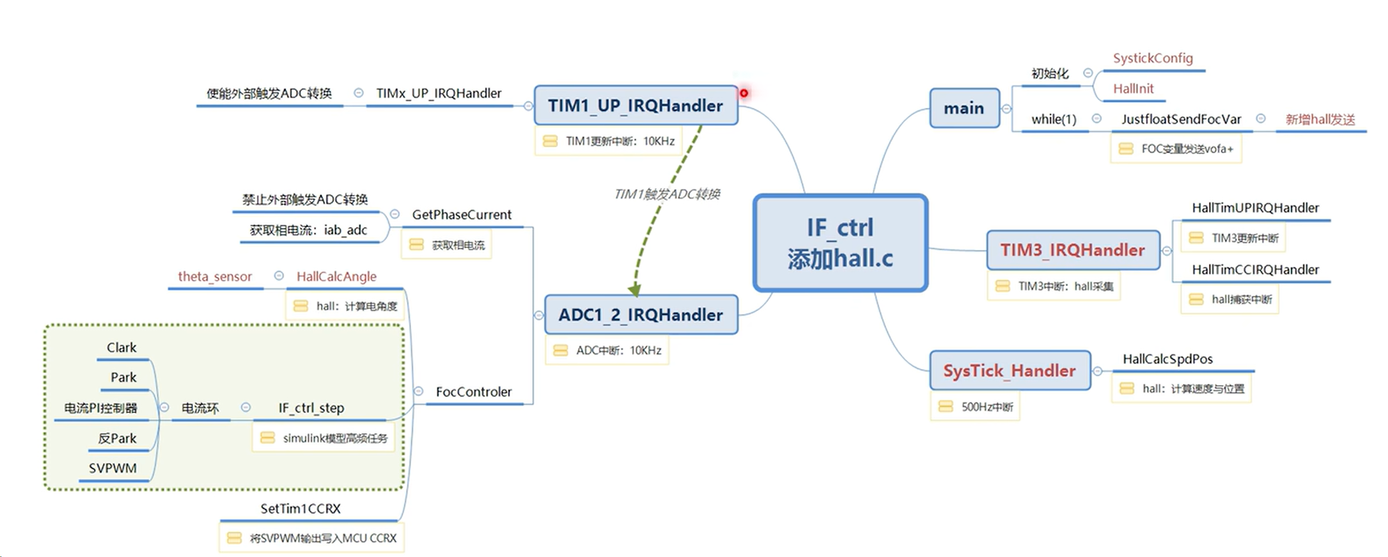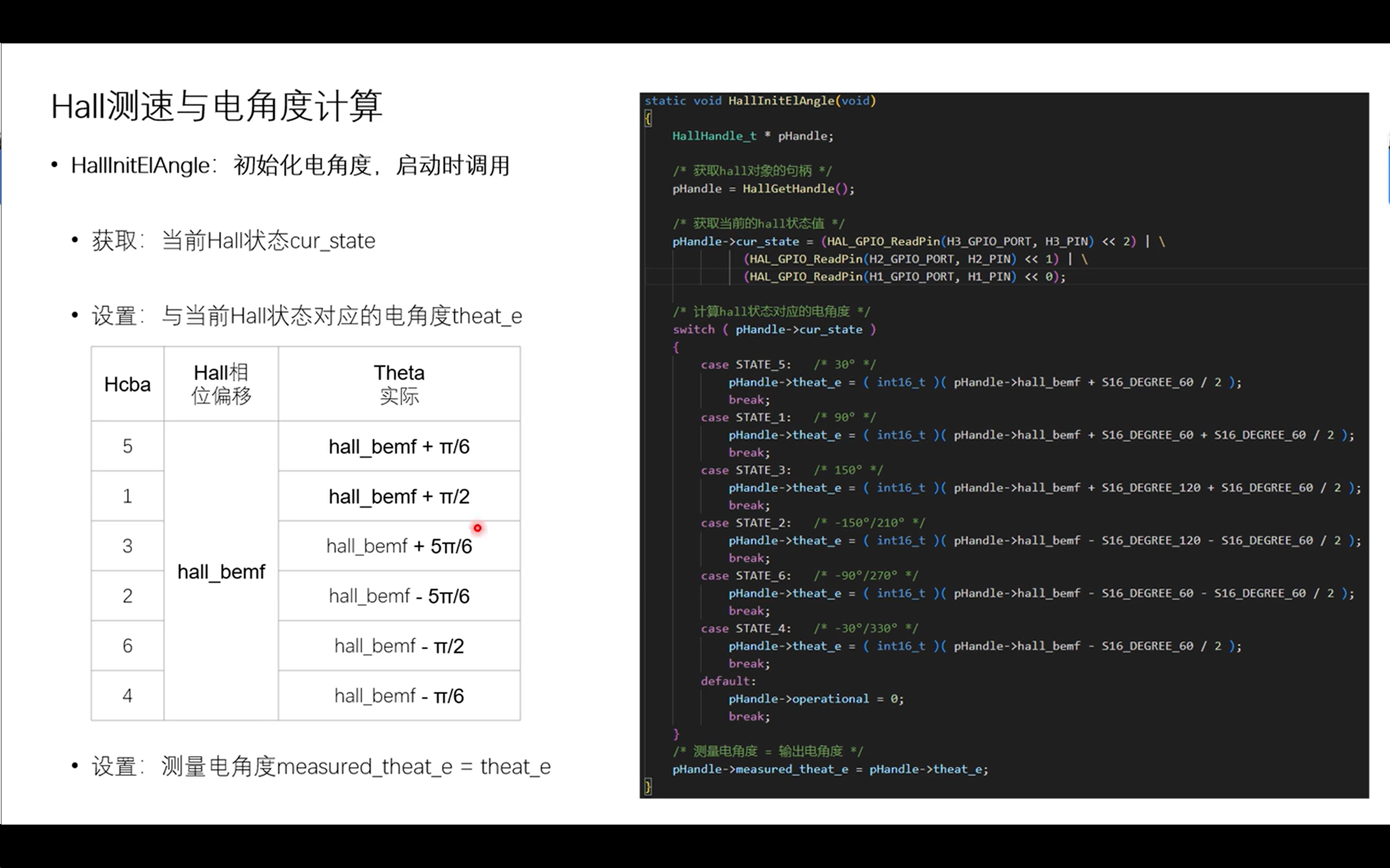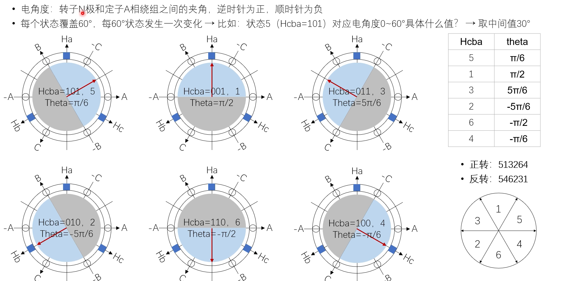 首先调用hall初始化电角度函数,通过GPIO读取当前的hall状态;根据当前hall状态设置对应的电角度,如下图表所示;