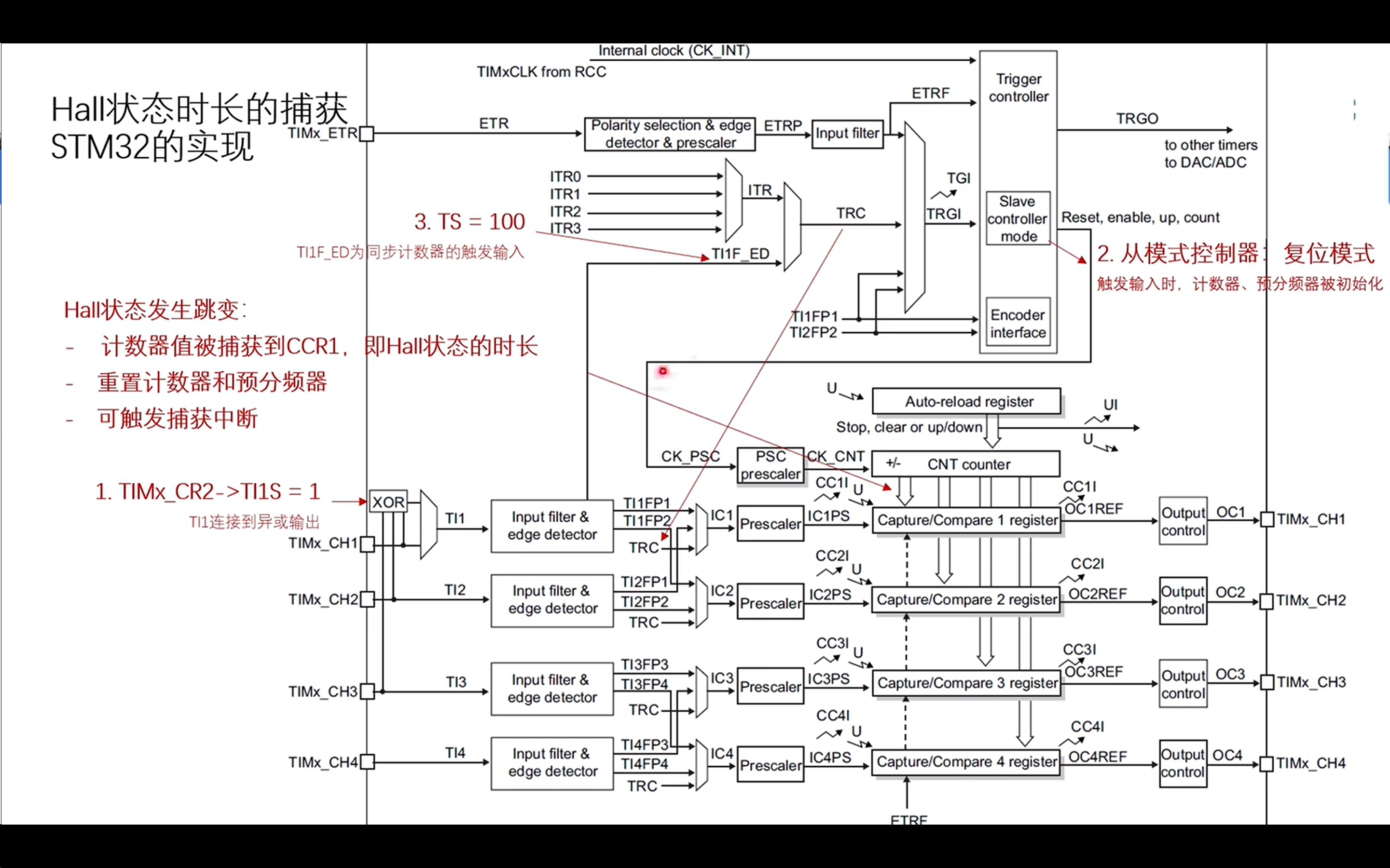 第一步配置控制寄存器2的TI1S位,使其等于1;它能够让TI1连接到三个霍尔传感器的异或输出;