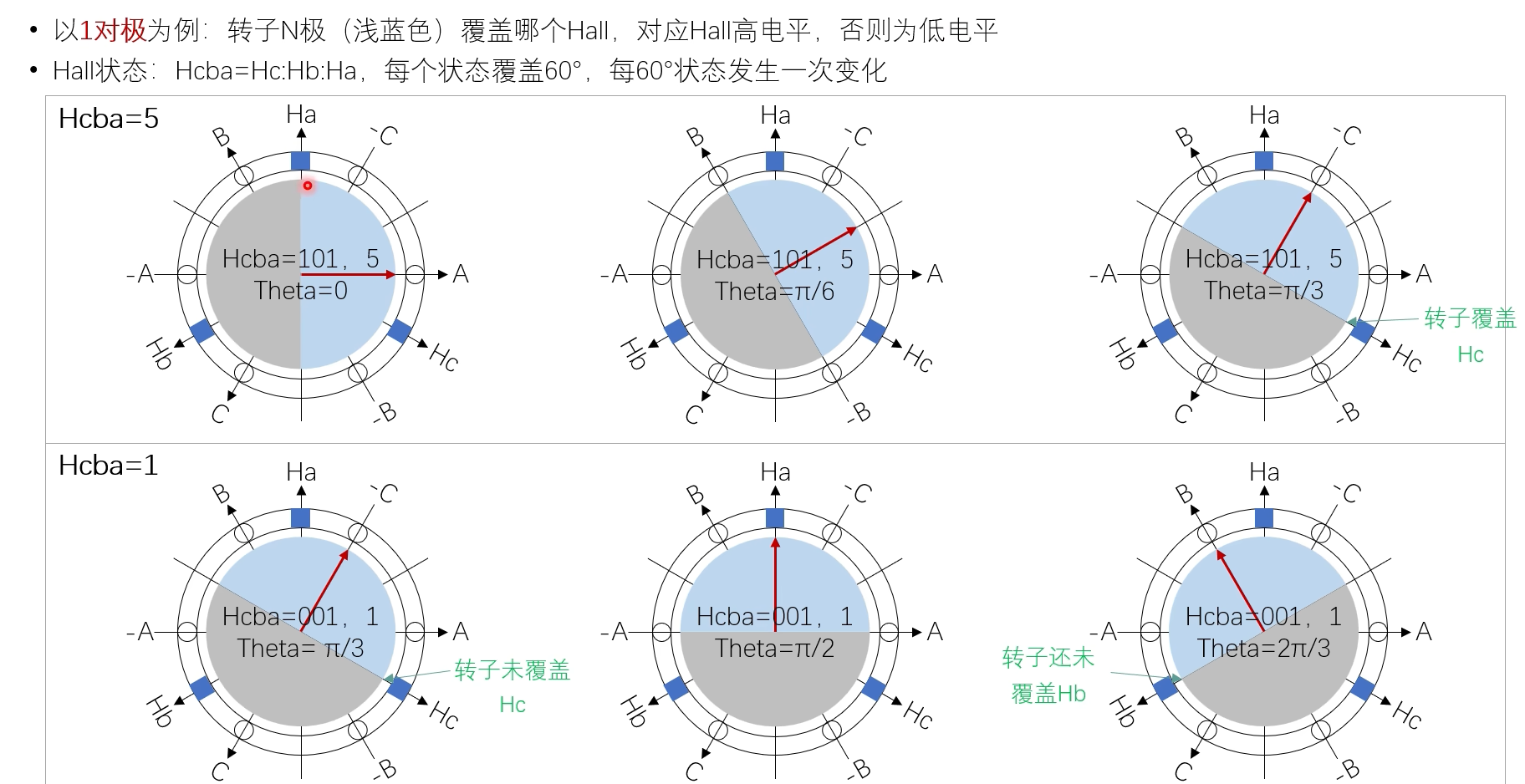 状态1,转子从刚刚离开HC开始,到转子即将覆盖HB为止;这个过程中转子仅仅覆盖着HA;它的状态就等于001;转子从60°到120°;