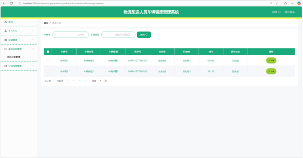 司机的承运任务管理页面展示了司机的所有任务信息。页面提供了承运任务的列表,包括车牌号、车辆类型、车辆排量、运单号、出发地、目的地、成本以及运单状态等关键信息。