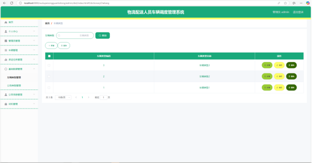 管理员的基础数据管理页面用于管理和维护系统中的基础数据,包括车辆类型管理、公告类型管理等。该页面展示了所有基础数据的列表,并提供了相关操作功能,如新增、修改和删除。