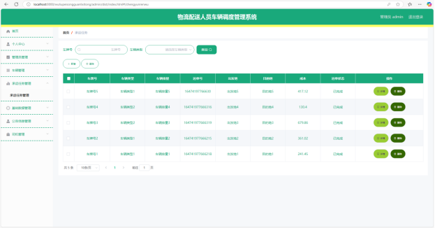 承运任务管理页面的设计简洁,操作直观,确保管理员能够高效管理和监控所有承运任务,提高物流配送的运作效率。如图5-2所示。