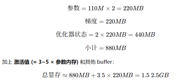 | 5️⃣ 其他开销 | 临时计算 buffer、CUDA 内核缓存 | ✅ | 一般为几百 MB 到几 GB |
