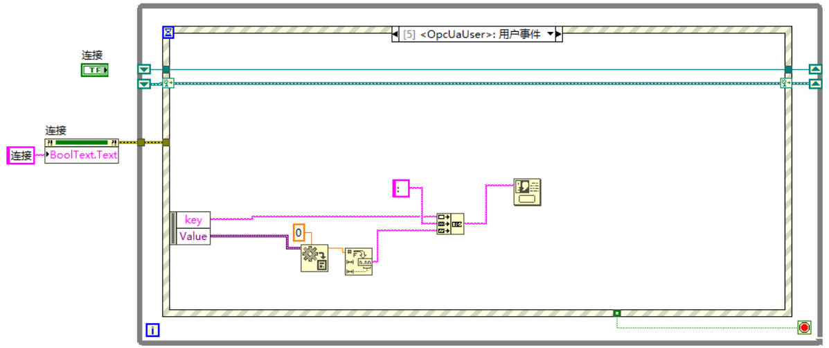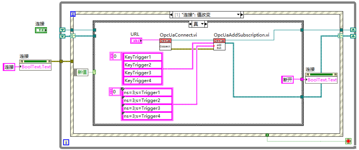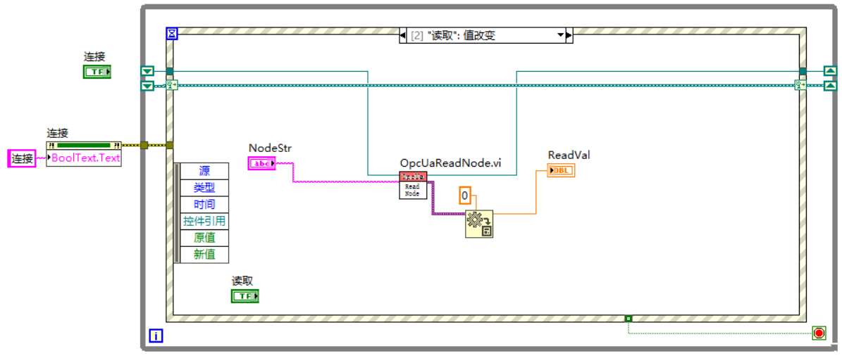 5)编写Labview程序,读写服务器中变量值,创建订阅触发事件;