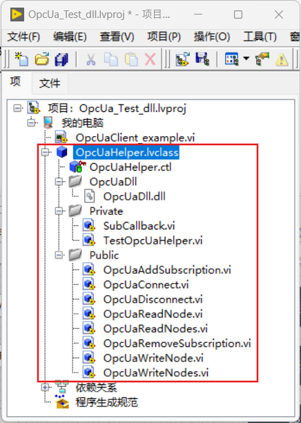 新建OpcUaHelper类如下,在类中新建多个子vi,该类用于集成OpcUa的通信。