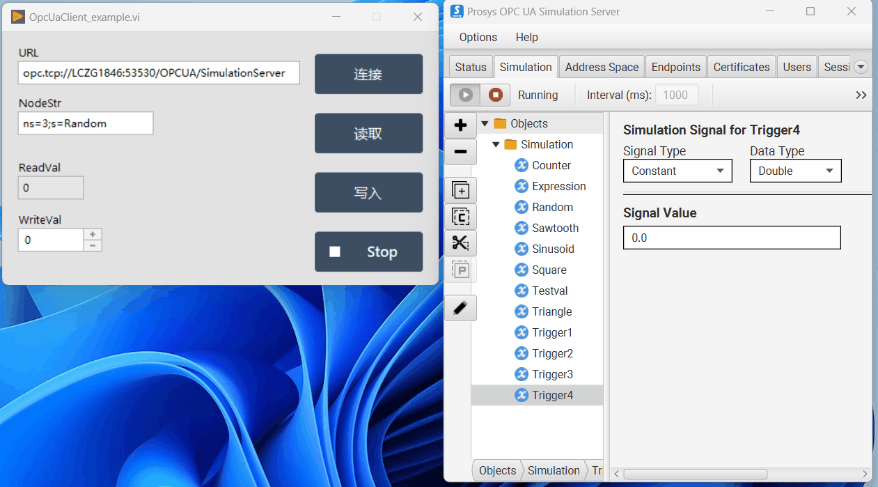 下图是根据上面的要求最终的运行结果,可以读写模拟服务器中的寄存器,OPC UA Simulation Server中的Trigger值变化会主动触发一个显示变化后值的弹窗。