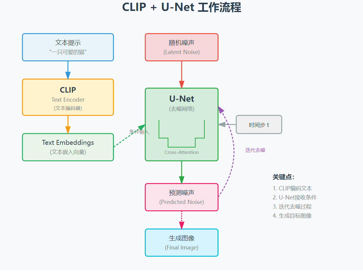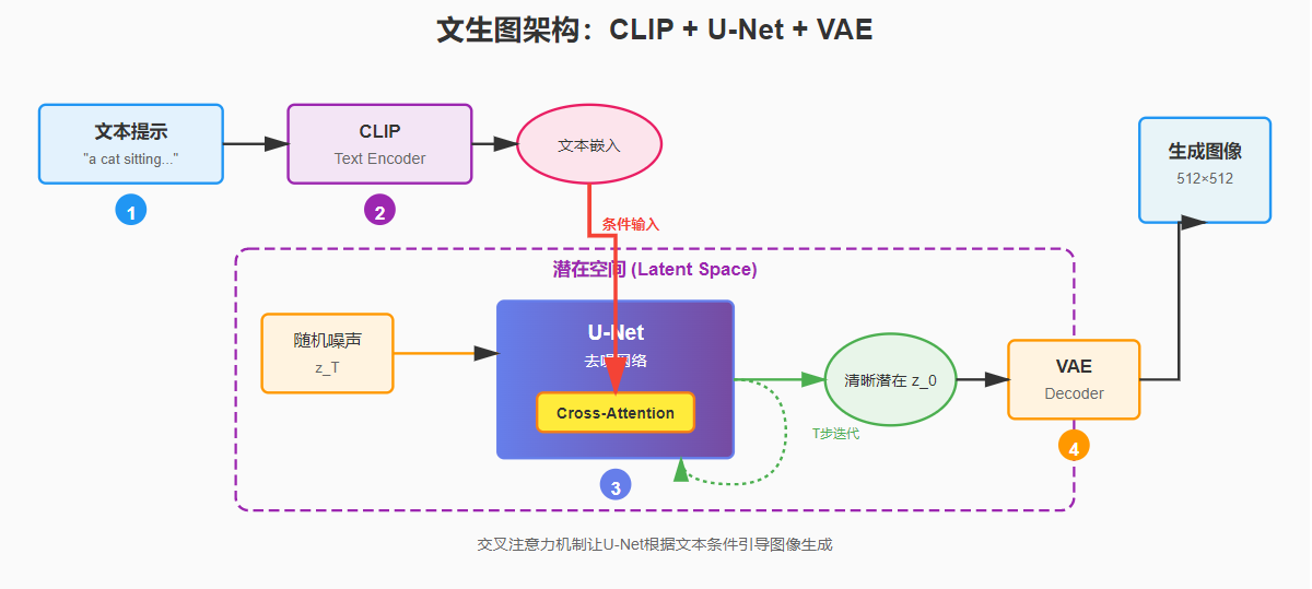 上面提到的所有内容和文生图还有一定距离,生成图像是怎么和我们输入的文本关联的呢?