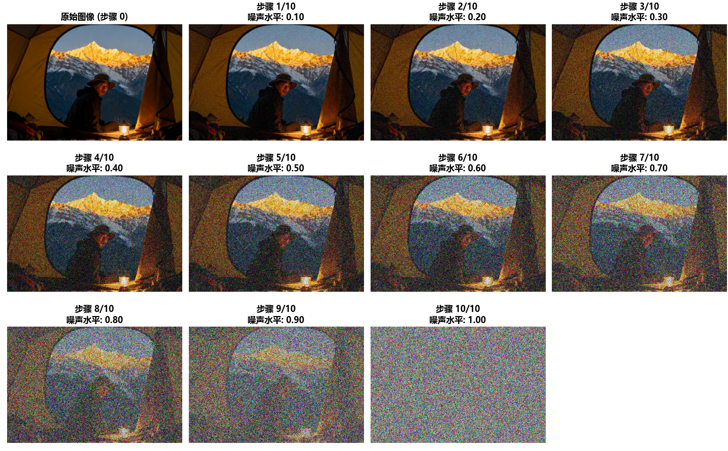 - 前向扩散:学习过程,即往图片中添加噪声的过程。