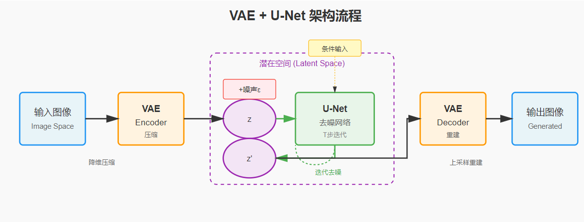 图片实际上非常复杂,常见的手机照片大约是:4032×3024 像素,每个像素会有3个维度 (3个0-255的数字表示颜色RGB)。对这样大的图像直接处理成本过高,我们需要对图片进行压缩(降维),这个压缩后的空间称为潜空间。处理压缩(编码)和解压(解码) 的常见模型为VAE。