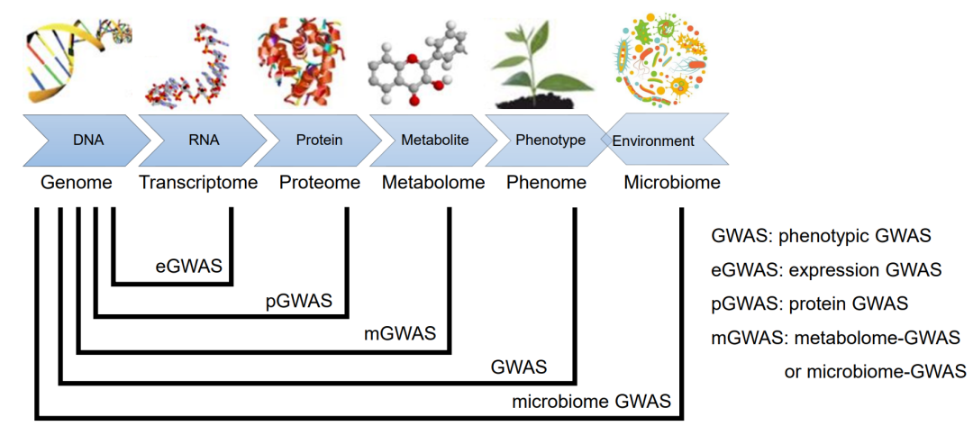 多组学方法可以大致分为基于遗传,表型和环境因素的方法[16]。基于基因型的多组学方法旨在使用全基因组关联研究来鉴定与疾病风险相关的位点。进一步检查位点区域可以帮助确定可能在疾病启动中起作用的候选基因。通过探索基因组和转录组水平上的突变或表达变化,可以进一步验证相关基因。