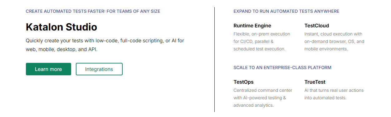Katalon Studio是整个平台的核心,是一个集成了AI能力的集成开发环境,支持Web、移动、API和桌面应用的测试自动化。