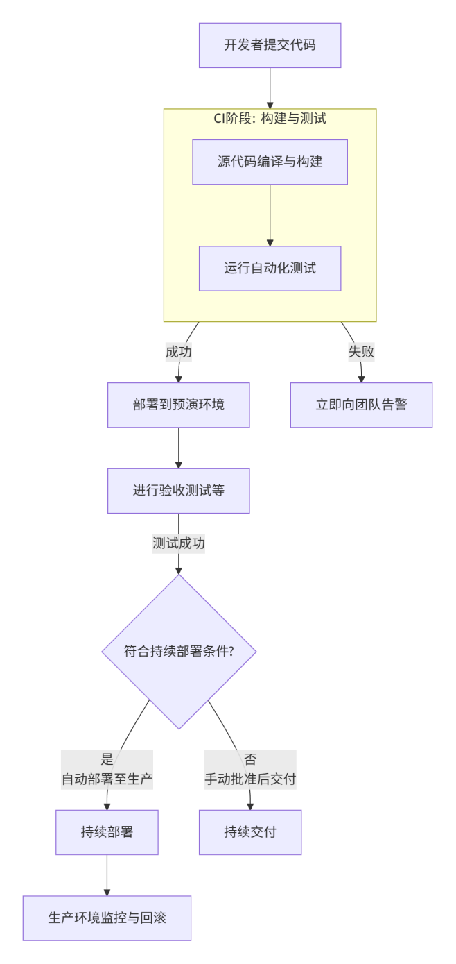 一个典型的CI/CD流水线(Pipeline)就像一条分阶段的质量检查装配线,下图展示了一个从代码提交到生产部署的完整 CI/CD 流程,包含了关键阶段和可能的路径 :
