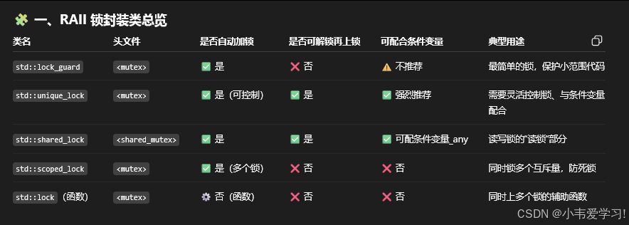 C++ 并发编程中“封装锁机制的智能 RAII 类(Resource Acquisition Is Initialization)”是多线程安全的关键组件。它们的核心思想是:利用对象的构造和析构自动完成加锁与解锁,防止因忘记解锁导致的死锁或未定义行为。