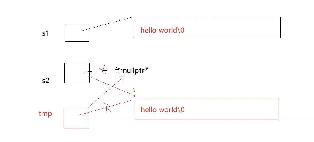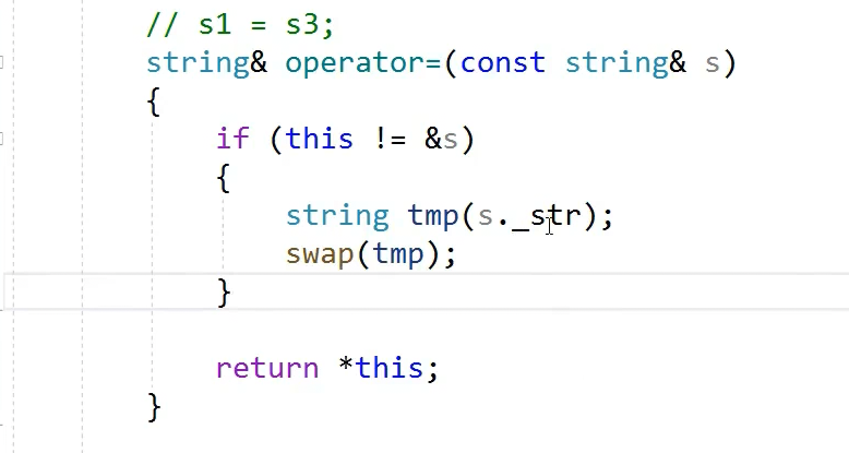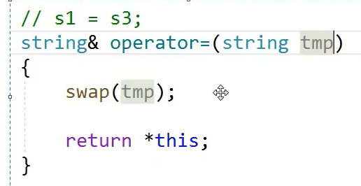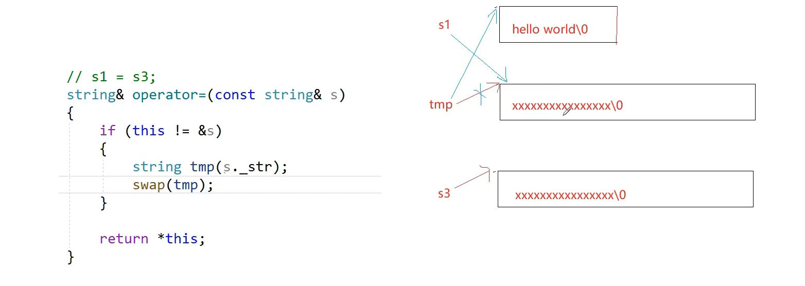 首先要把自己的值释放,,tmp先把s3拷贝,this 也就是s1跟tmp交换