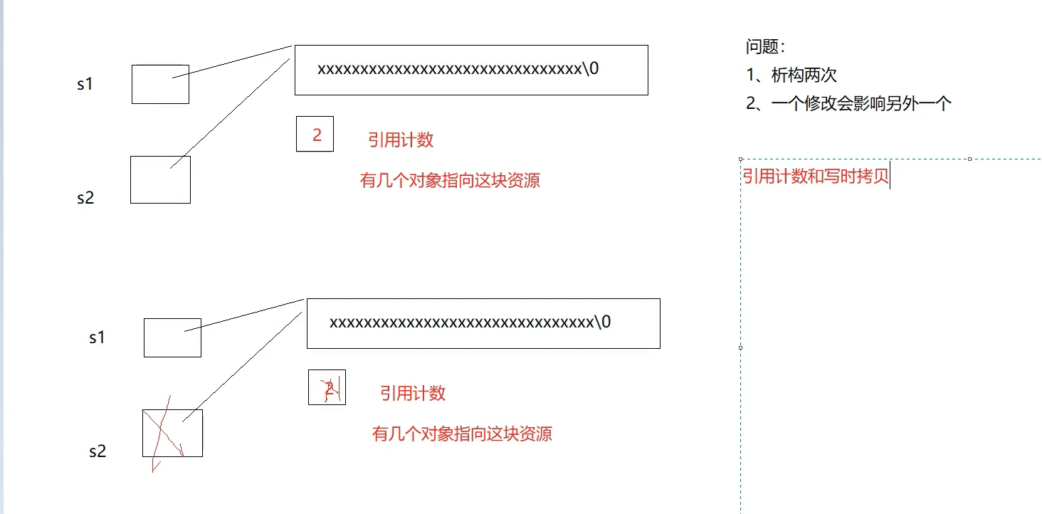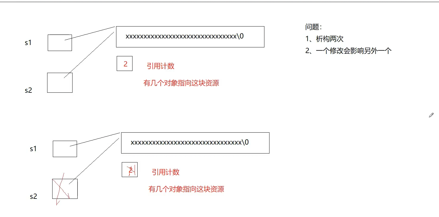 s2如果要修改,计数不是1,我要做深拷贝计数减减,减到1,然后指向我的资源 ,然后修改