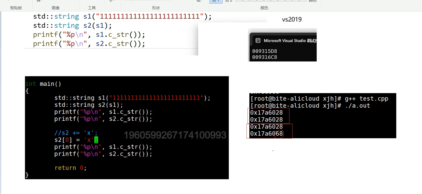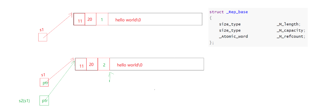 G++string里面只有一个指针,先存size capacity 和引用计数,s1对象只有一个指针,他是四个字节或者八个字节,指向这块哦空间,类似柔性数组,结构和后面空间放到一起