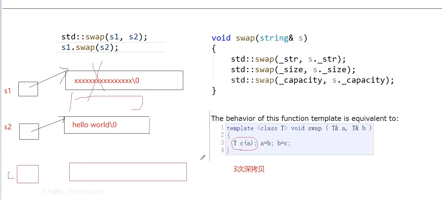 为什么还要自己整个swap,,传统swap交换是构造,s1拷贝构造一个c深拷贝,b就是s2,赋值给s1这又是一次深拷贝,,再赋值,共三次深拷贝,代价大,