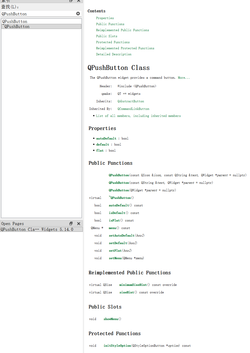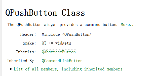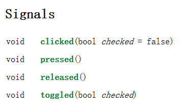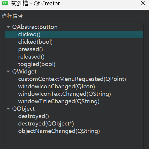 这个窗口就列出了 QPushButton 给我们提供的所有的信号(还包含了它父类的信号)