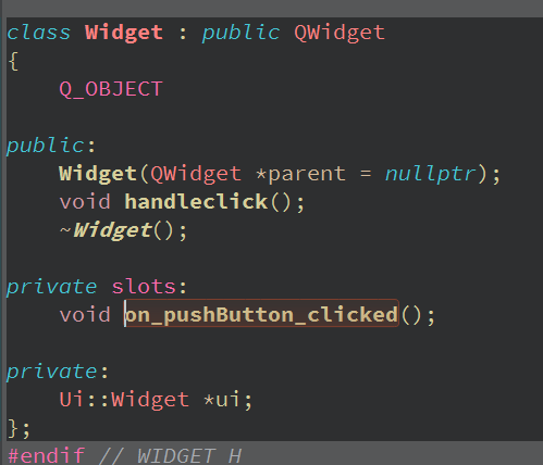{Q_OBJECTpublic:Widget(QWidget *parent = nullptr);void handleclick();~Widget();private:Ui::Widget *ui;