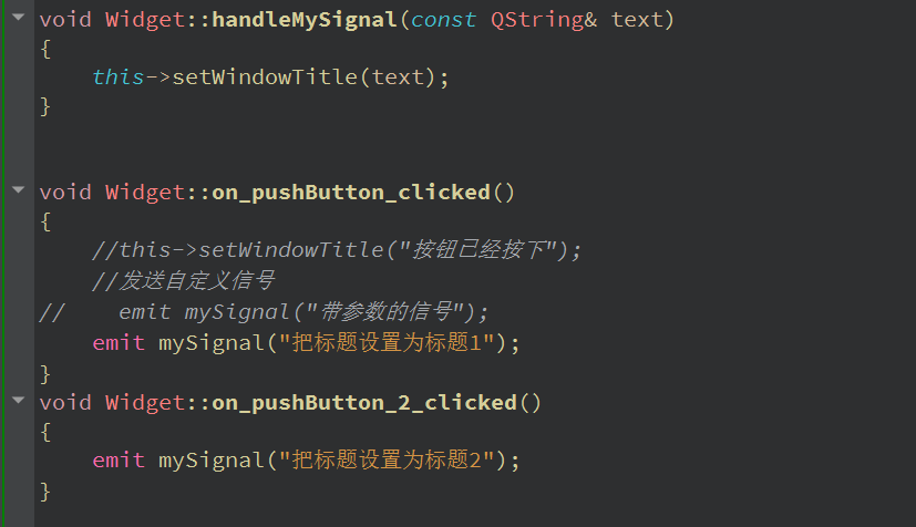 {ui->setupUi(this);connect(this,&Widget::mySignal,this,&Widget::handleMySignal);//发送自定义信号emit mySignal();