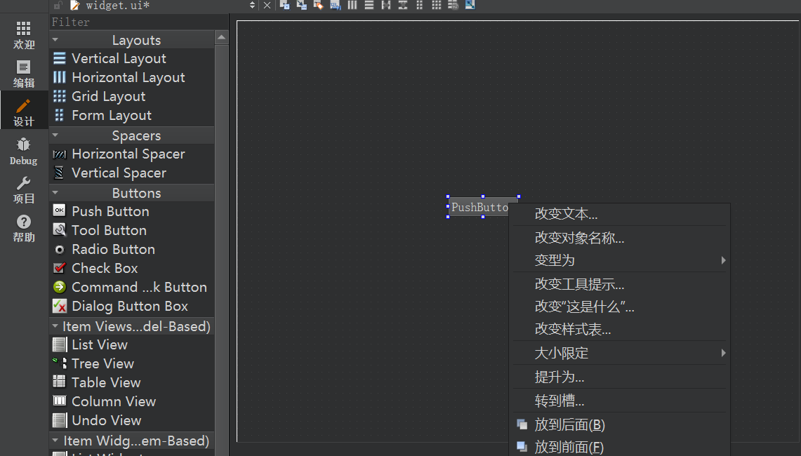 转到设计界面,拖过去一个push button 按钮,右键此按钮有一个转到槽的选项
