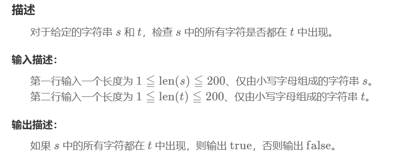 public static void main(String[] args) {Scanner scanner = new Scanner(System.in);String s = scanner.nextLine();String t = scanner.nextLine();boolean result = checkContainsOptimized(s, t);System.out.println(result);scanner.close();}public static boolean checkContainsOptimized(String s, String t) {// 创建布尔数组记录t中出现的字符(小写字母共26个)boolean[] charExists = new boolean[26];// 标记t中出现的所有字符for (int i = 0; i < t.length(); i++) {char c = t.charAt(i);charExists[c - 'a'] = true;}// 检查s中的每个字符是否都在t中出现过for (int i = 0; i < s.length(); i++) {char c = s.charAt(i);if (!charExists[c - 'a']) {return false;}}return true;}