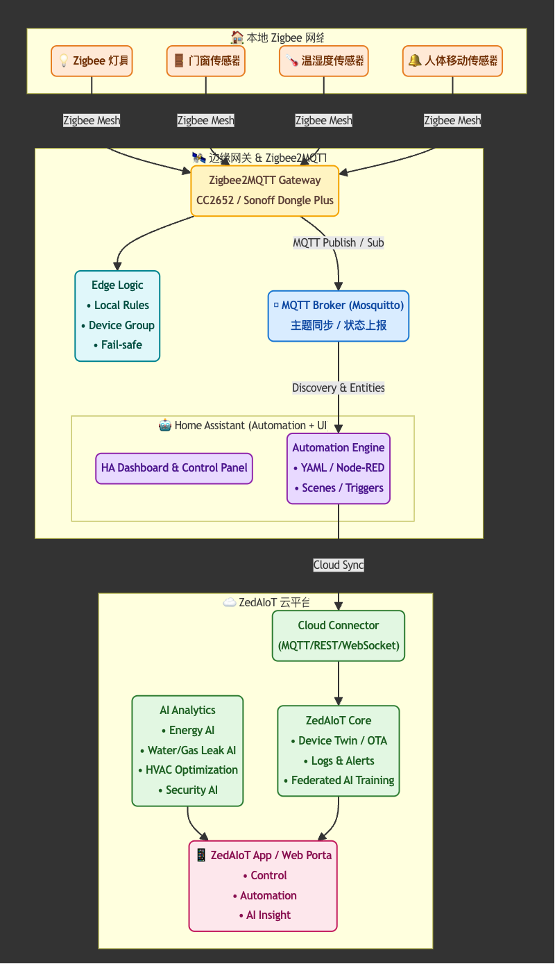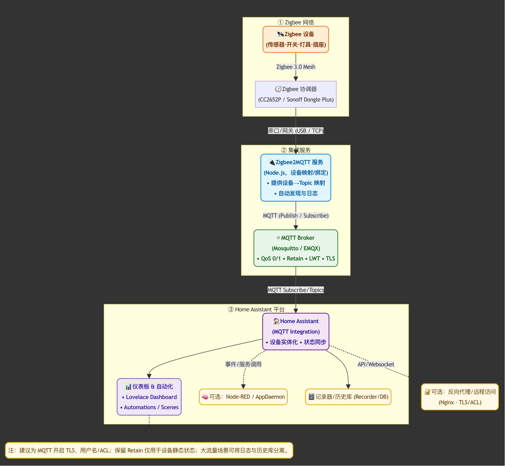 | 设备层 | Zigbee2MQTT + 协调器 | 本地设备通信与接入 |