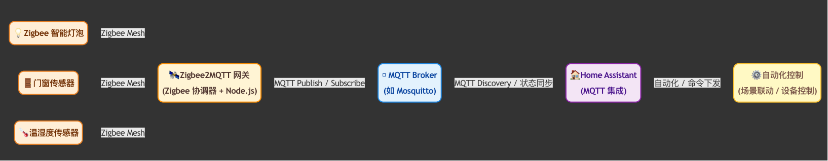 Zigbee设备通过Zigbee2MQTT与MQTT服务器通信,再由Home Assistant统一管理与联动。