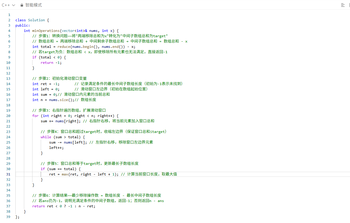 - 通过问题转化将两端移除问题转化为中间子数组问题,利用滑动窗口高效寻找最长满足条件的子数组。