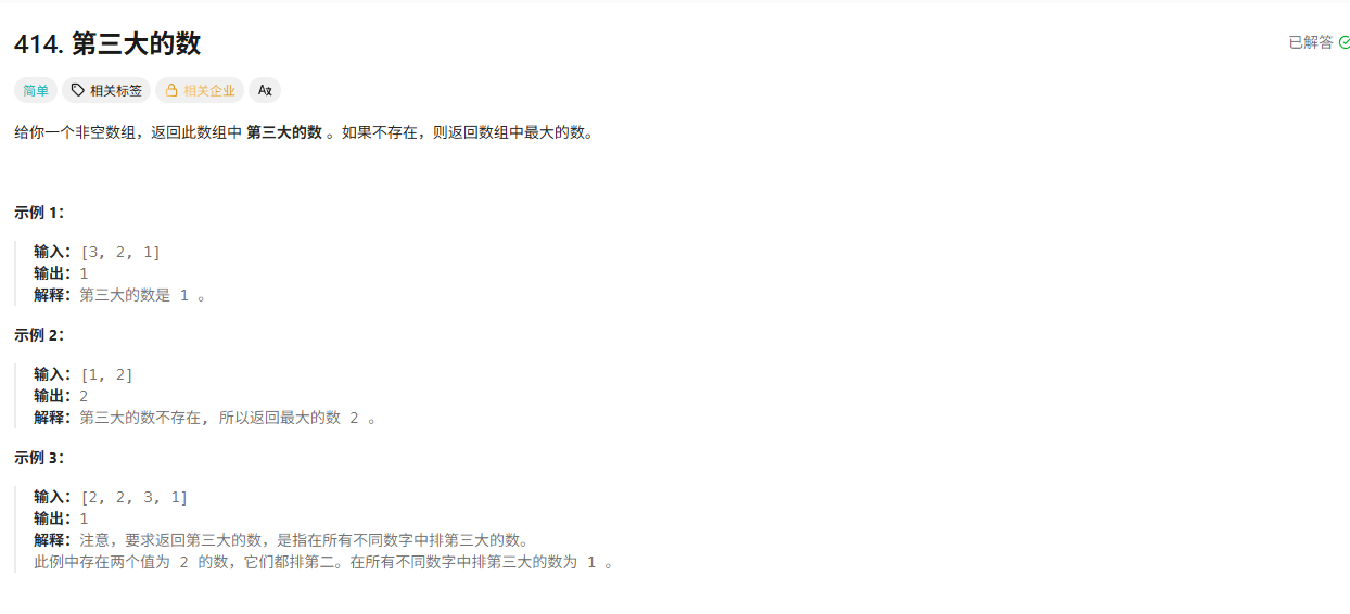 - 判断与返回:根据去重后的元素数量判断是否存在第三大的元素。如果元素数量不少于 3,则返回第三大的元素(即排序后倒数第三个元素);否则返回最大的元素(即排序后最后一个元素)。