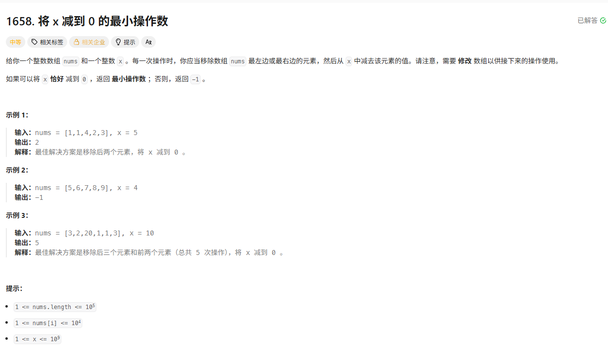 x,求最少移除次数。 - 转化后:寻找数组中间连续子数组,使子数组总和为
