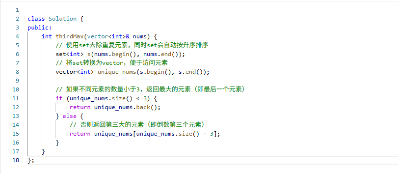 set转换为vector,以便更方便地通过索引访问元素。 - 判断元素数量:检查去重排序后的元素数量。如果数量小于 3,说明不存在第三大的元素,返回最大元素(即向量的最后一个元素);如果数量不少于 3,则返回第三大的元素(即向量中倒数第三个元素)。