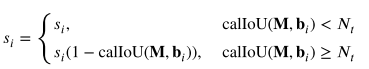 if IoU(M, b_i) >= threshold:s_i = s_i * (1 - IoU(M, b_i)) # 降低置信度而非直接删除