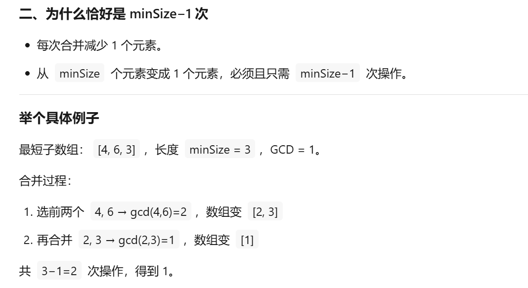 如果 nums 中没有 1,想办法花费尽量少的操作得出一个 1。由于只能操作相邻的数,所以这个 1 必然是一个连续子数组的 GCD。(如果在不连续的情况下得到了 1,那么这个 1 只能属于其中某个连续子数组,其余的操作是多余的。)那么找到最短的 GCD 为 1 的子数组,设其长度为 minSize,那么我们需要操作 minSize−1 次得到 1。例如 [2,6,3,4] 中的 [3,4] 可以操作 2−1=1 次得到 1。