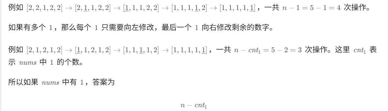 首先,如果所有数的 GCD(最大公约数)大于 1,那么无论如何都无法操作出 1,我们返回 −1。如果 nums 中有一个 1,那么从 1 向左向右不断替换就能把所有数变成 1。