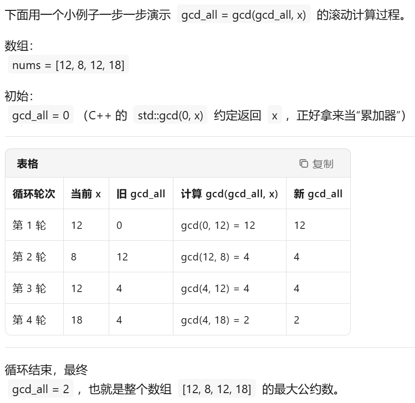 public:int minOperations(vector<int>& nums) {int n=nums.size();int gcd_all=0,cnt1=0; //数学上规定:gcd(0, x) = |x|for(int x :nums){gcd_all=gcd(gcd_all,x);if(x==1) cnt1++;}if(gcd_all>1) return -1;//如果 nums 中存在 1if(cnt1) return n-cnt1;int minSize=n;for(int i=0;i<n;i++){ //找最短的 GCD 为 1 的子数组int g=0;for(int j=i;j<n;j++){g=gcd(g,nums[j]);if(g==1){minSize=min(minSize,j-i+1); //需要操作 minSize−1 次得到 1break;}}}return minSize+n-2;}